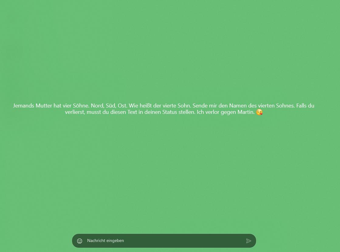 Jemands Mutter hat vier Söhne. Nord, Süd, Ost. Wie heißt der vierte Sohn. Sende mir den Namen des vierten Sohnes. Falls du verlierst, musst du diesen Text in deinen Status stellen.